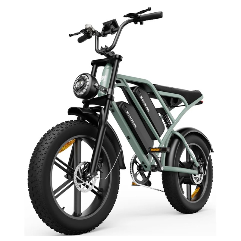Cycrown CycHunter Dual Battery Electric Bike quipped with a Full Suspension System, Hydraulic Fork, Rear Shock Absorber, and Highly Elastic Saddle, the CycHunter delivers superior shock absorption for a smooth and comfortable ride on any terrain.